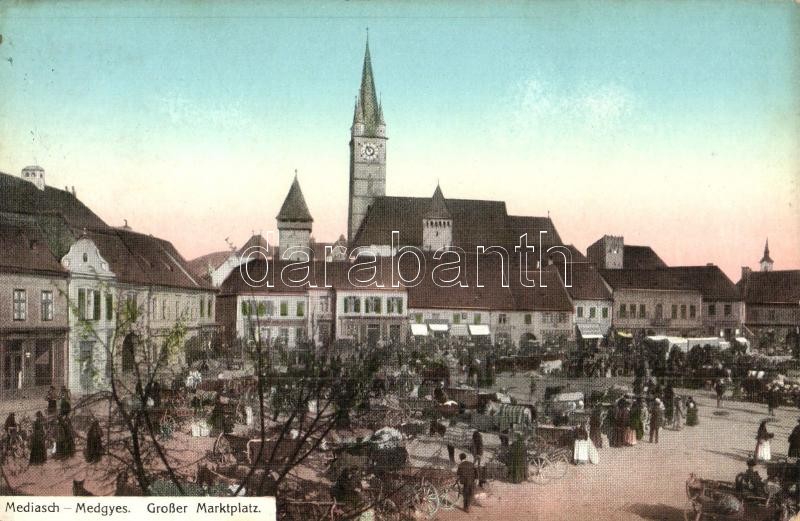 Medgyes, Mediasch, Medias; Großer Marktplatz / Piactér, árusok, Evangélikus templom, Trombitás torony, üzletek. Fritz Guggenberger 92/1. / marketplace, vendors, Lutheran church, tower, shops (EK)