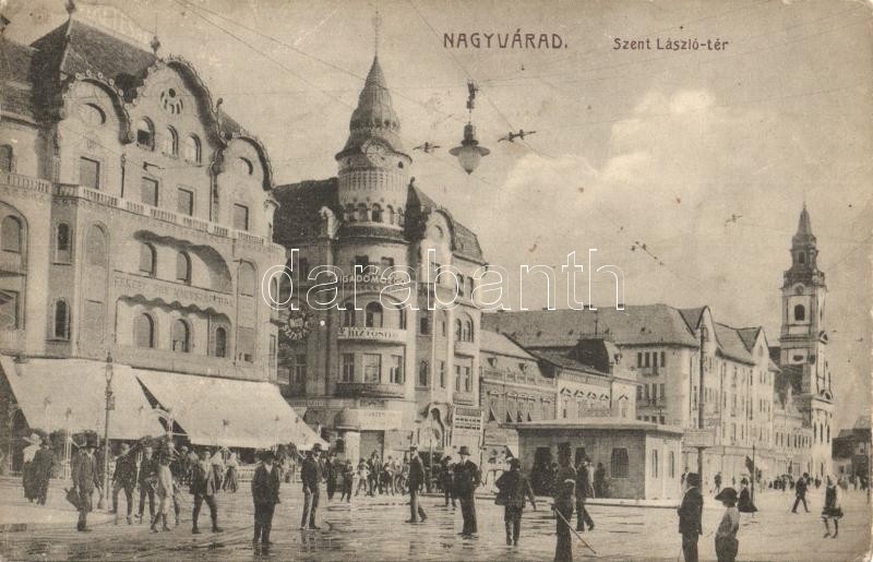 Nagyvárad, Oradea; Szent László tér, Fekete Sas szálloda, Vigadó mozgó (mozi), Biztosító intézet, üzletek. Rigler József Ede kiadása / square, hotel, cinema, insurance company, shops