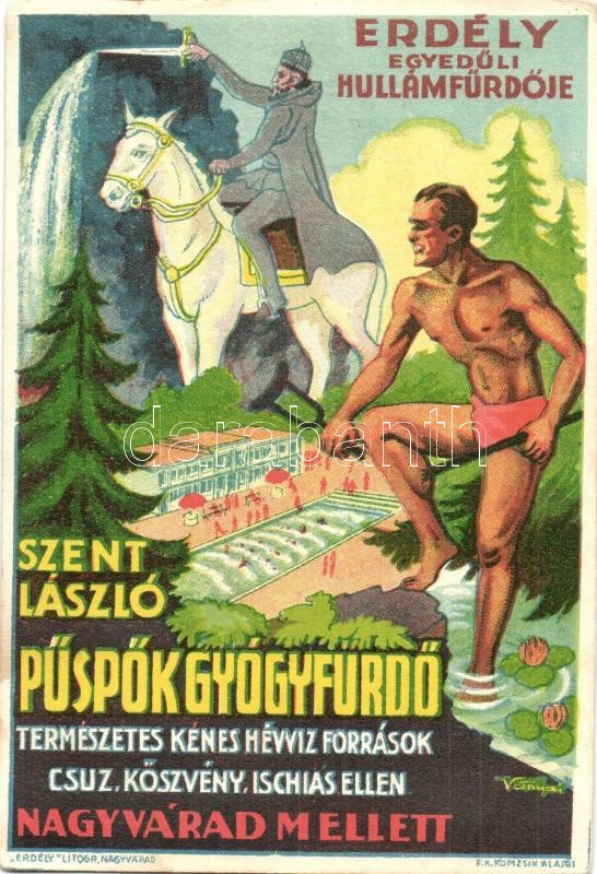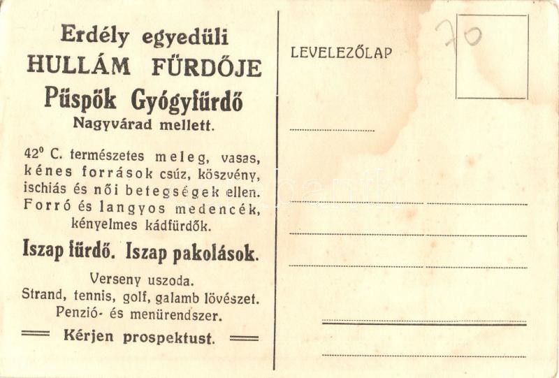 Description: Püspökfürdő, Szentlászlófürdő, Baile 1 Mai; Erdély egyedüli hullámfürdője Szent László Püspök gyógyfürdő Nagyvárad mellett. Erdély litogr. Felelős kiadó Komzsik Alajos. reklámlap / The only wave pool in Transylvania! spa and bathing hall advertising art postcard. s: Ványai (EK)