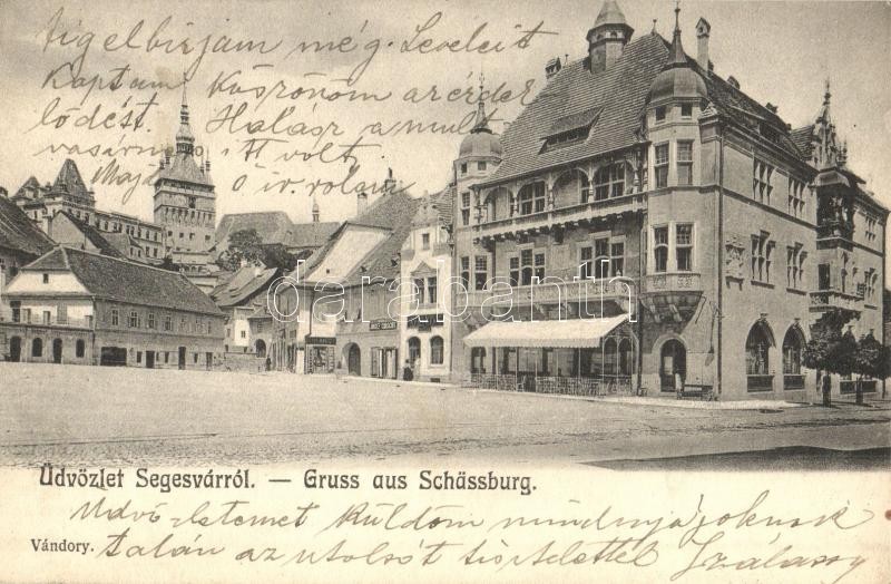 Segesvár, Schässburg, Sighisoara; Fő tér, Gyógyszertár, Josef Girscht üzlete. Vándory kiadása / Hauptplatz, Apotheke / main square, pharmacy, shops