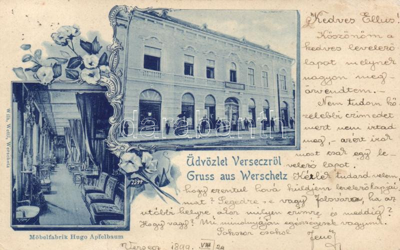 1899 Versec, Vrsac; Leonil Schulz üzlete, Hugo Apfelbaum bútorgyára / ...