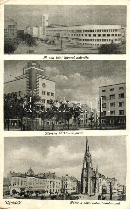 Újvidék, Novi Sad; a volt báni hivatal palotája, Horthy Miklós sugárút, Fő tér, templom, villamos, Zima Károly és Társa kiadása / palace, street, square, church, tram (EK)