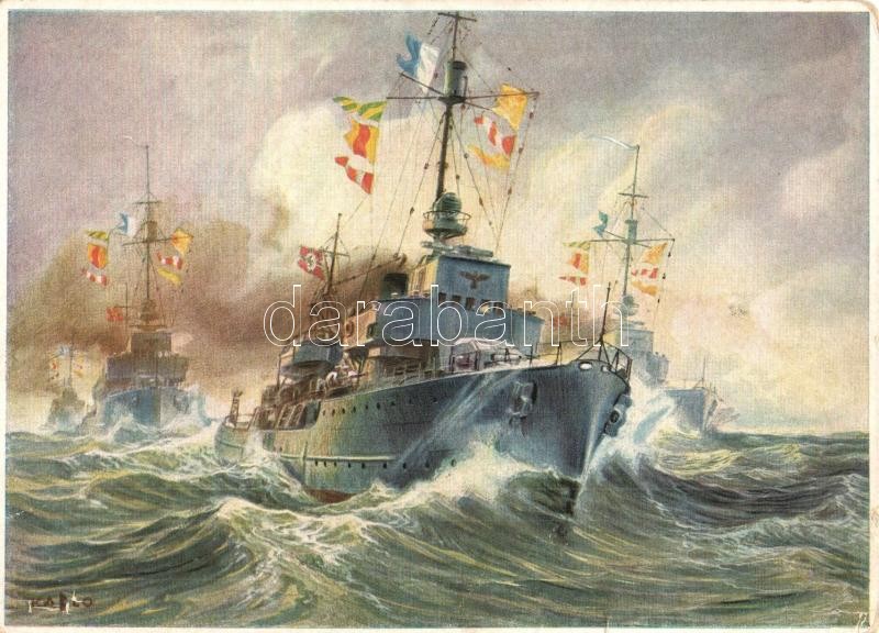 Description: Wehrmachts-Postkarten Serie 3, Bild 1, Kleinkampfschiffe auf dem Marsch / WWII German Navy small battleship, art postcard, s: Kablo (kis szakadás / small tear)