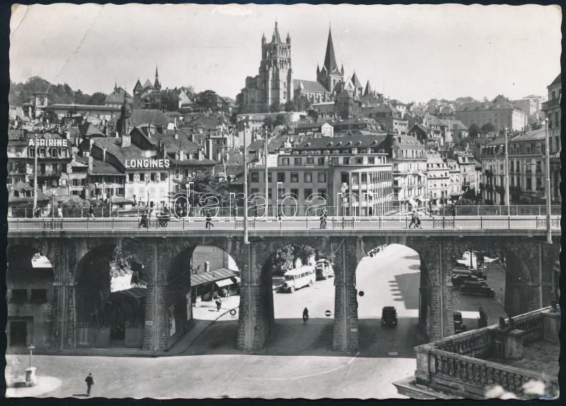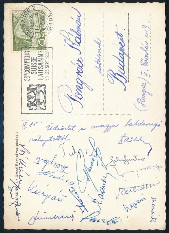 1955 Lausanne, Aranycsapat tajgai által küldött üdvözlő képeslap Pongrácz Kálmán (1898-1980) Budapest főpolgármestere (Budapest Főváros Tanácsa VB elnöke(1950-1958)) részére, saját kezű aláírásaikkal, közte Sebes Gusztáv edző, Buzánszky Jenő, Kárpáti Béla, Bozsik József, Szojka Ferenc, Raduly József, Kocsis Sándor, Machos Ferenc, Puskás Ferenc, Hidegkuti Nándor, Tichy Lajos és mások, (Svájc-Magyarország 4:5, 1955.09.17.) / 1955 Hungarian football team, the "Golden Team" or "Mighty Magyars" autographs on a postcard after Switzerland-Hungary 4:5 match