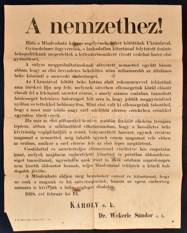 1918 A nemzethez!, propaganda plakát, benne az Ukrajnával (Ukránia) való békekötés hírével, "Győzedelmes fegyvereink, s lankadatlan kitartással folytatott őszinte békepolitikánk megérlelték a létfenntartásunkért vívott védelmi harcz első gyümölcsét.",1918. feb. 12., Bp., M. Kir. Állami Nyomda, hajtásnyomokkal, kis szakadásokkal, kis lyukkal, kis foltokkal, 59x45 cm. / Hungarian propaganda poster with the news of peace treaty with Ukraine, 12th of February 1918, with small damages.