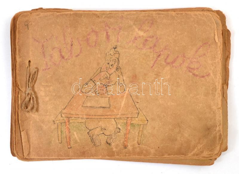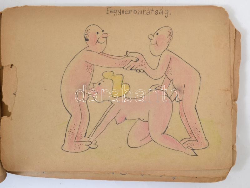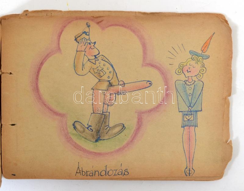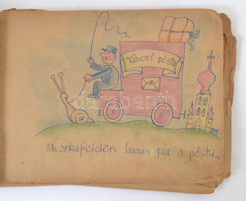 1944 Tábori lapok 46 db kézzel rajzolt tábori posta levelezőlap, egybe fűzve. Nagyrészt az orosz front eseményeit bemutató humoros darabok, valamint kb 10 db erotikus lap. Kopott széllel, néhányon beszakadásokkal. / Booklet made of 46 hand drawn field post postal stationery cards incuding several erotic. In worn condition.