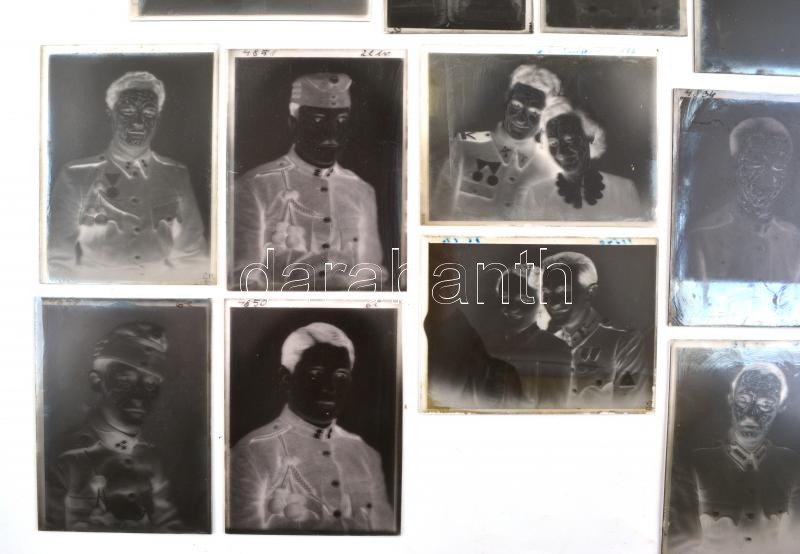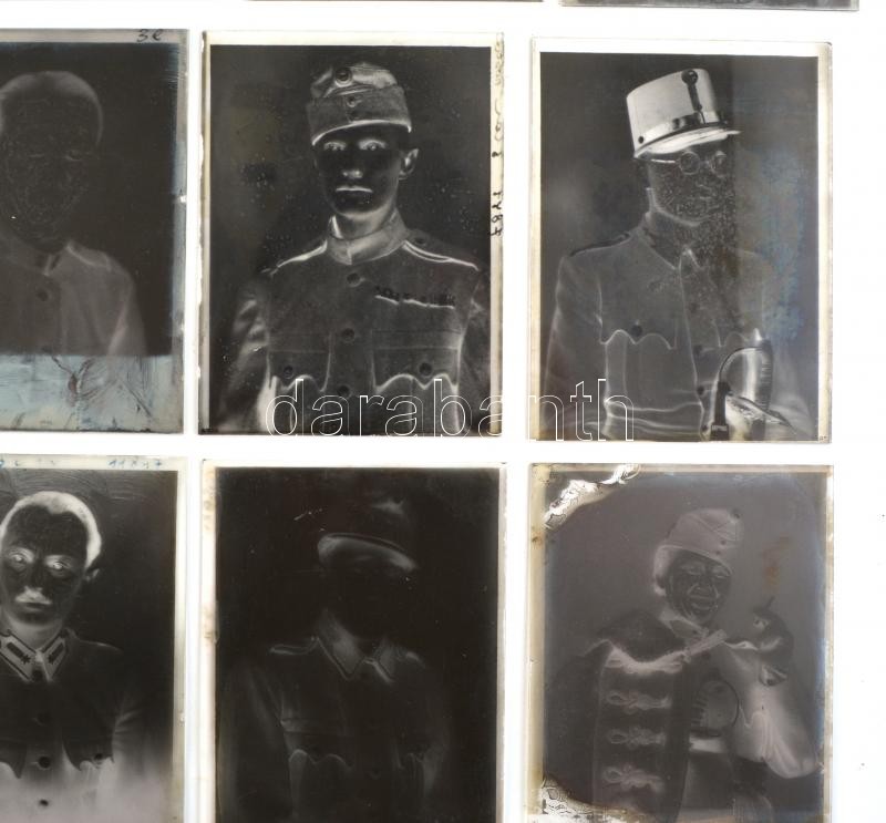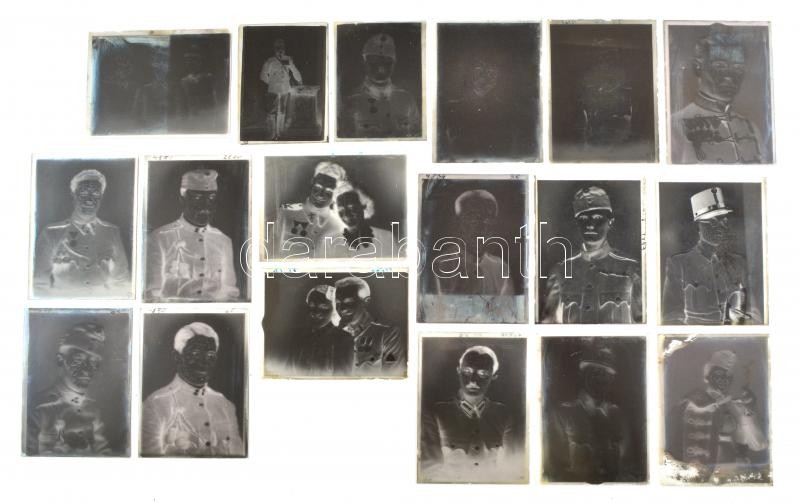 cca 1944 Katonák a kiskunfélegyházi Marika-Fotó műteremben, 18 db vintage üveglemez negatív, 6x9 cm és 9x12 cm