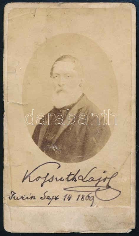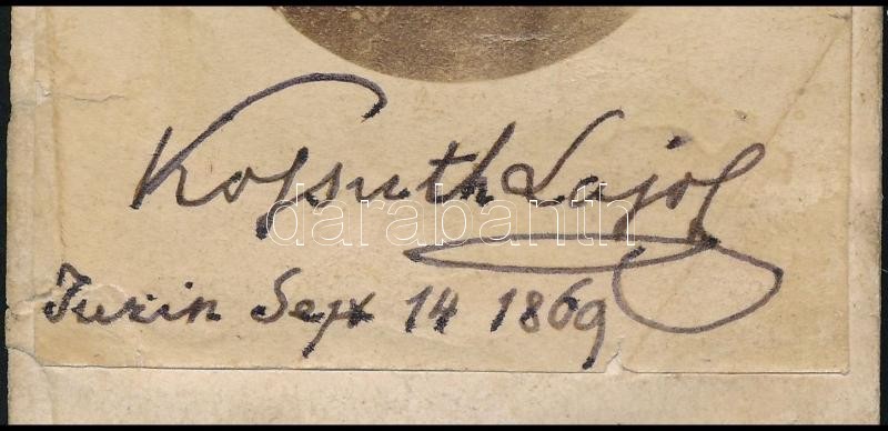 1869 Kossuth Lajos (1802-1894) fényképe, rajta egy hozzá közel álló személytÅ‘l származó utólagos dedikációjával, fotó kartonon, a karton kissé elvált, a felületén folt, sérülés és javÃtásnyomok, 10x6 cm