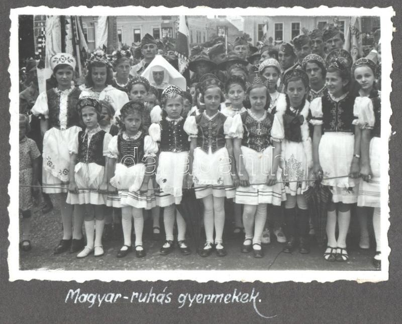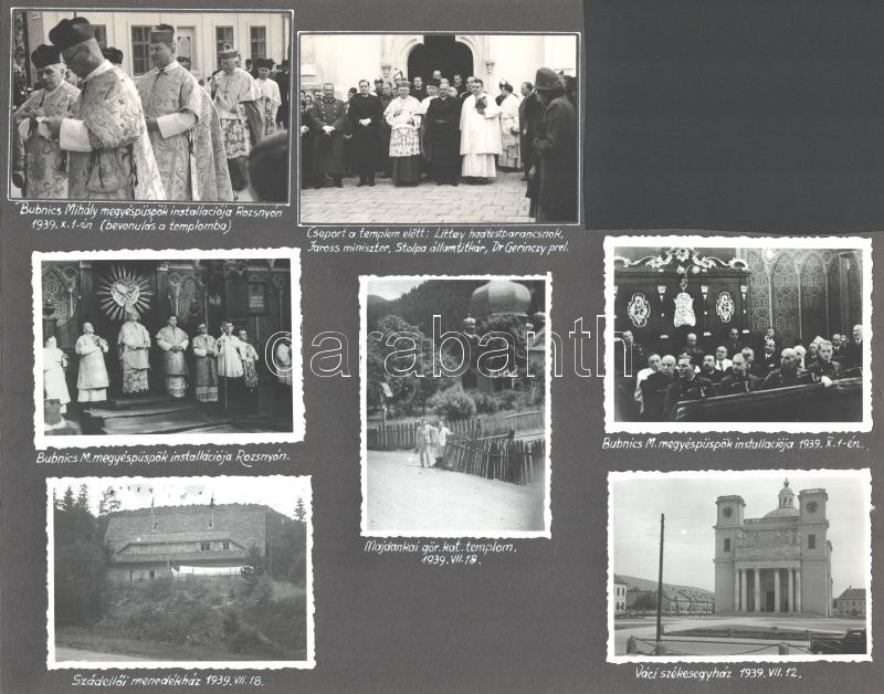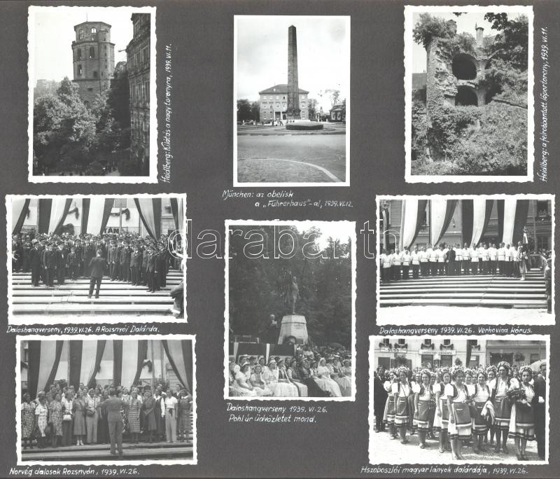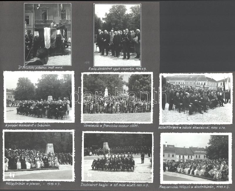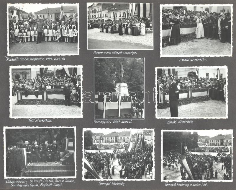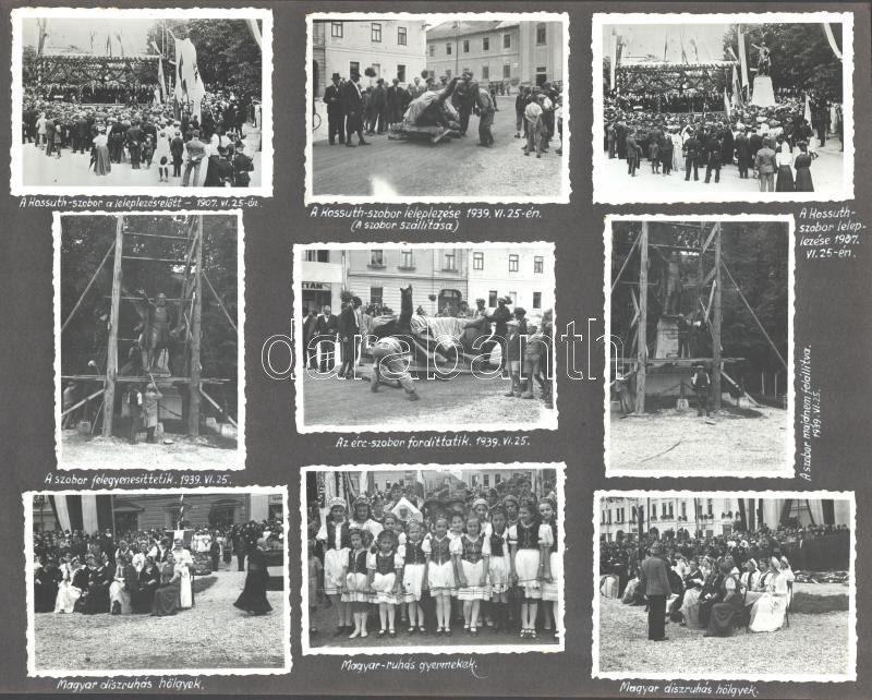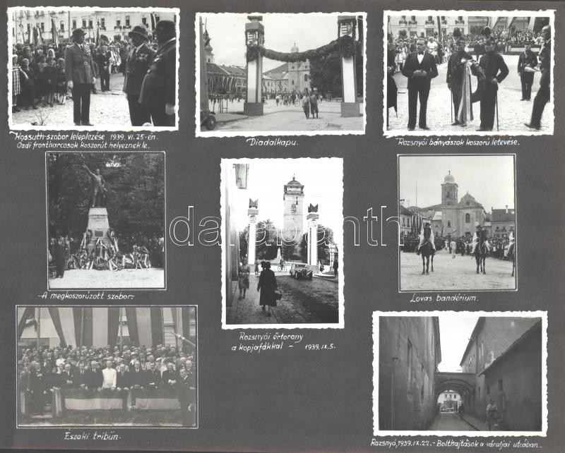 1939 A rozsnyói Kossuth szobor visszaállÃtása, leleplezése, és a felavatási ünnepség fotói, és további fotók Rozsnyóról, 1939. márc. 15-1939. okt. 1., feliratozva, 7 albumlapon 63 fotó, néhány máshol készült fotóval (München (1db), Heidelberg (2db), Vác (1db), Majdanka (1db), SzádelÅ‘i menedékház (1 db),Budapest (8db)), két albumlapon kivágással, 6x8 cm és 7x6 cm közötti méretben