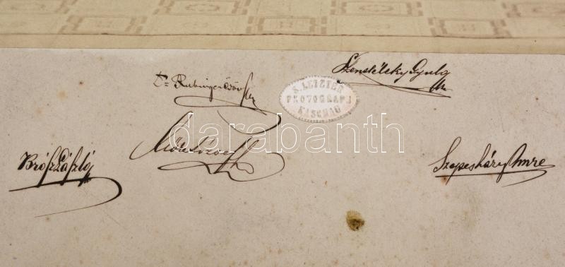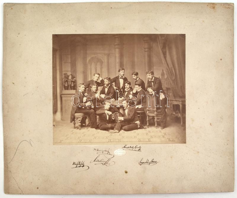 cca 1873 Kassa, mulatozó fiatalok, öt diák aláírásával, a diákok között Brósz László korábbi eperjesi kollégiumi diákkal, fotó karton, Kassa, S. Letzter, 18x22 cm / cca 1873 Košice, vintage photo from the studio of S. Letzter, Kosice, showing partying young students, with autographs, 18x22 cm