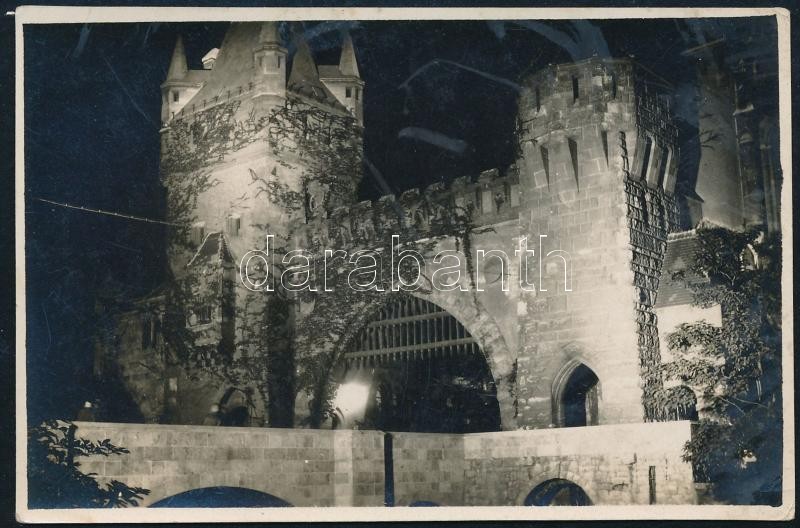Description: cca 1931 Kinszki Imre (1901-1945) budapesti fotóművész hagyatékából, jelzés nélküli, vintage fotó (Éjszakai kivilágításban a Vajdahunyad vára), 5,5x8,4 cm