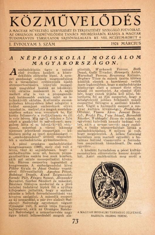 1924 Közművelődés. A magyar műveltség szervezését és terjesztését szolgáló folyóirat. I. évf. 1.-2., 3, 4., 5., 6., 7.-8., 9. és 10.. szám. Szerk. Czakó Elemér. (Bp.), 1924, Magyar Tudományos Társulatok Sajtóvállalata Rt. A lapból össz. 10 szám jelent meg, majd megszűnt, így komplett. Divald Kornél, Klebelsberg Kunó, Apponyi Albert, Lukács György, Domanovszky Sándor, Eckhardt Sándor, Herczeg Ferenc, Móra Ferenc és mások írásaival. Tűzött kiadói papírkötés, helyenként kopott, enyhén szakadt borítóval. Ritka!