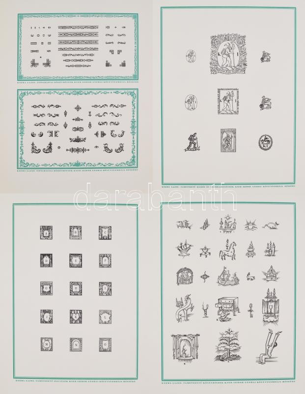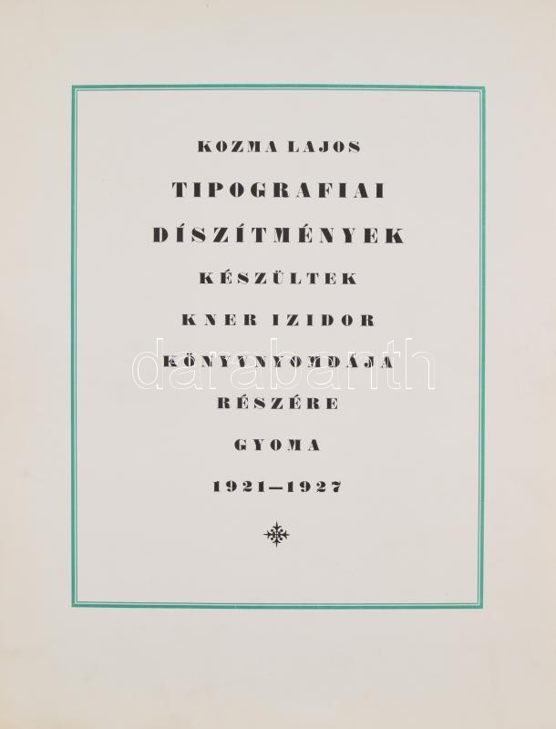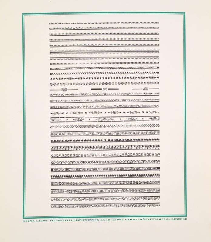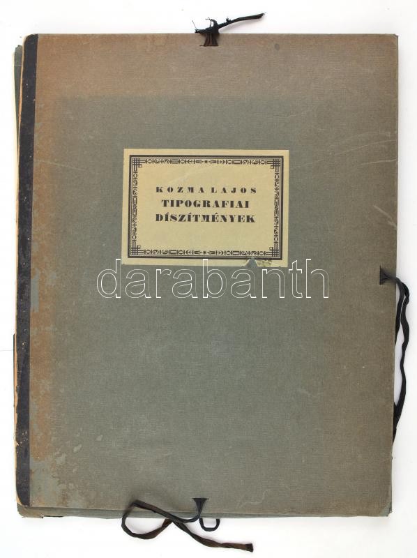 1927 Kozma Lajos (1884-1948) tipográfiai díszítmények. Készültek Kner Izidor Könyvnyomdája részére. Gyoma. 1921-1927. Gyoma, 1927, Kner, 1 (fametszetű díszcímlap)+13 (fametszetű táblák) t. Magyar nyelven. Kiadói félbőr mappában, kissé kopott, kissé foltos mappával, a gerinc sérült, szétvált, a mappa egyik madzagja részben hiányos. Feltehetőleg nem teljes, (1 tábla hiánnyal (?) Méret: 40x50 cm. Nagyon ritka mintalap-gyűjtemény. Árverésen még nem szerepelt.