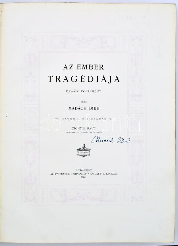 Madách Imre: Az ember tragédiája. Drámai költemény. Zichy Mihály húsz ... https://www.darabanth.com/en/33-Major-auction/33.1/Books/Books-Other-rarities~13891/Madach-Imre-Az-ember-tragediaja-Dramai-koltemeny-Zichy-Mihaly-husz-kepevel-Bp-1905-~II2139848