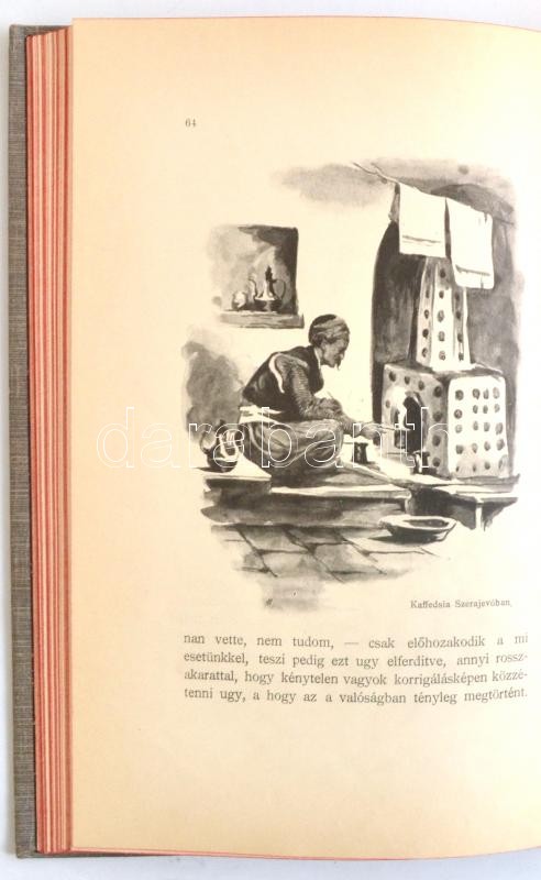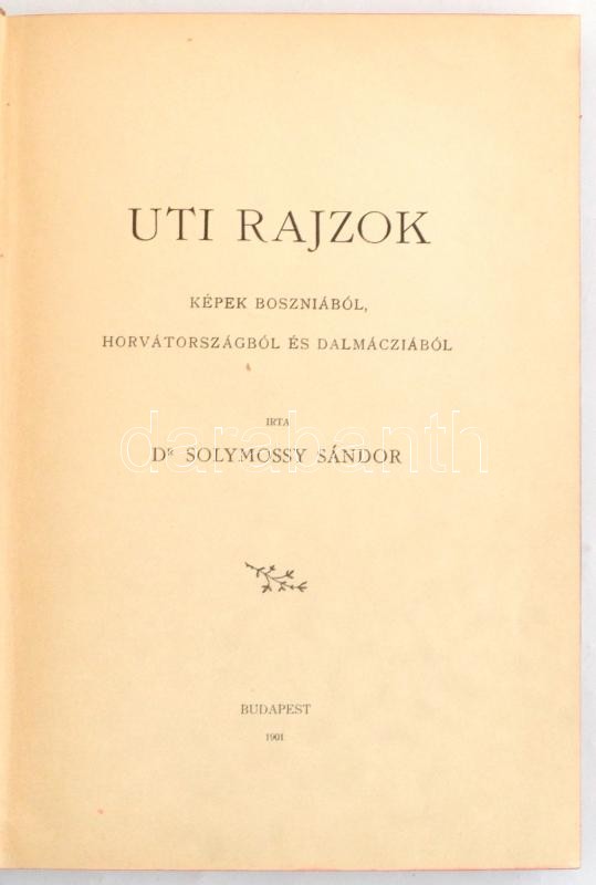 Dr. Solymossy Sándor: Uti rajzok. Képek Boszniából, Horvátországból és Dalmáciából. Bp.,1901, (Pesti Könyvnyomda Rt.), 4+244+1 p. Kiadói aranyozott, festett, egészvászon-kötés, Gottermayer-kötés, festett lapélekkel, a hátsó szennylap hiányzik, egy lapon kis szakadással./ Solymossy, Sándor: Travelogue. Pictures from Bosnia, Croatia, and Dalmatia. Gilt linen-binding, with coloured page edges, the back smear-sheet lost, with little tear on one sheet. In Hungarian language.