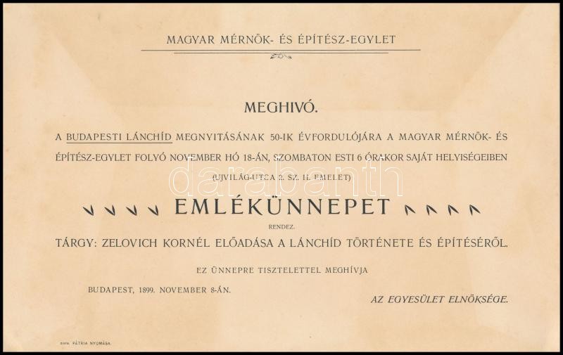 Zelovich Kornél: A budapesti Lánchíd. Különlenyomat a M. M. és Építész-Egyl. Heti Értesítőjének 1899. nov. 19-iki számából. Bp., 1899, "Pátria",40 p.+1 t. (kihajtható látképpel. Kiadói papírkötés.+1899 Magyar Mérnök- és Építész-Egylet meghívója a Lánchíd megnyitásának 50-ik évfordulójára rendezett emlékünnepségre, 1899. nov. 8., előadást tart: Zelovich Kornél a Lánchíd történetéről és építéséről, borítékkal.