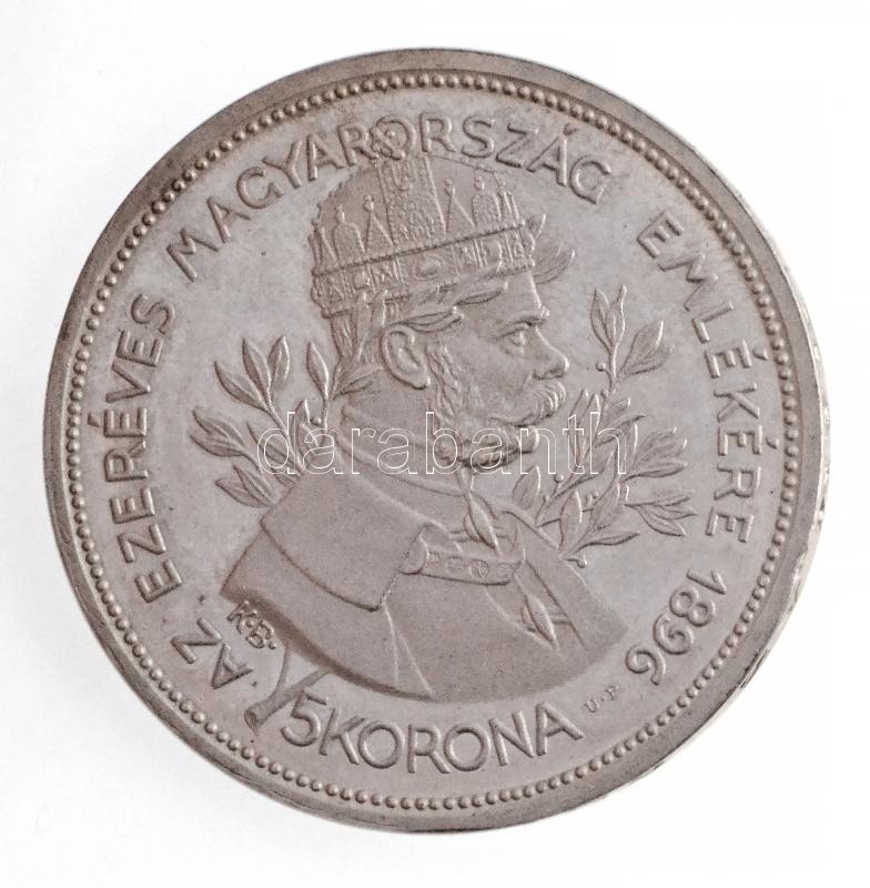 1896KB 5K Ag "Az ezeréves Magyarország emlékére" 1967-ben készült, U.P. jelzéssel (24,26g/36mm) T:1,1- / Hungary 1896KB 5 Korona Ag "1000th Anniversary of the Hungarian state" restrike made in 1967 with U.P. mark (24,26g/36mm) C:UNC,AU