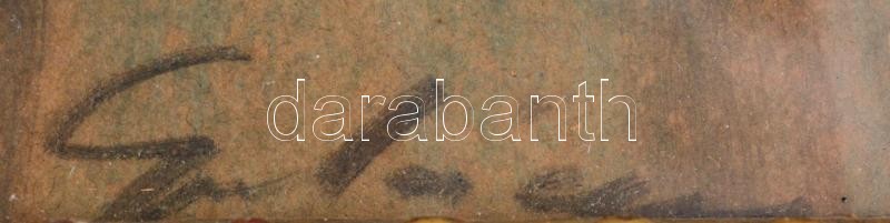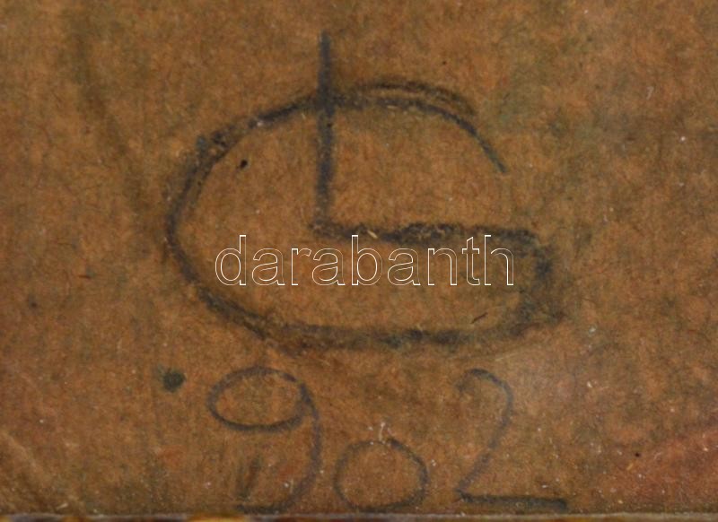Gulácsy Lajos (1882-1932): Pipázó önarckép festőállvánnyal. Ceruza, kréta, papírlemez. Jelezve balra lent: GL 902, jobbra lent: Gulácsy. Proveniencia: 1930-as évektől Gegesi Kiss Pál (1900-1993), orvos, műgyűjtő, majd családja tulajdonában. Marosvölgyi Gábor művészettörténész, Gulácsy Lajos monográfusának öt oldalas szakvéleményével, idézet a szakvélemény 2. oldaláról: "A mű vonalas, rajzos stílusa pontosan megfelel Gulácsynak az 1902-es évekre jellemző rajztechnikájának. Az ebben az időben készült grafikákon leginkább a szecesszió stílusjegyei ismerhetők fel, többek között a testeket körülíró, játékosan kanyargó vonalhasználat. (...)". Üvegezett, díszes fa keretben. 315x355 mm.