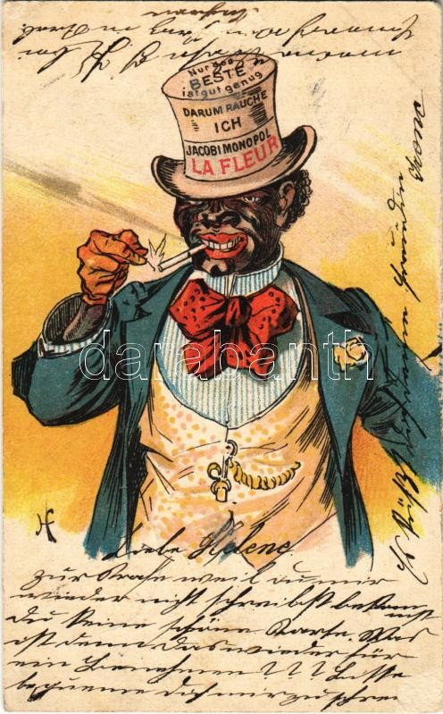 1900 Nur das beste ist gut genug, darum rauche ich Jacobi Monopol La Fleur / French cigarette advertisement with black man. litho (Rb)
