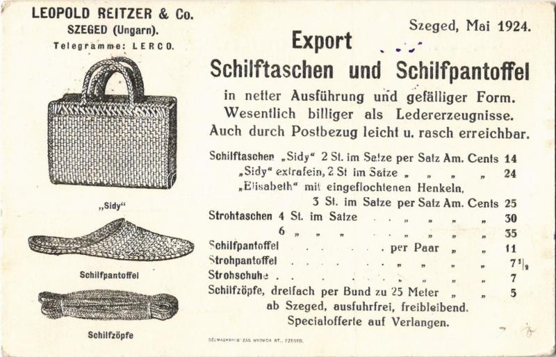 1924 Szeged, Leopold Reitzer & Co. nádtáska és nádpapucs gyára / Export Schilftaschen und Schilfpantoffel / Hungarian reed bags and slippers advertisement