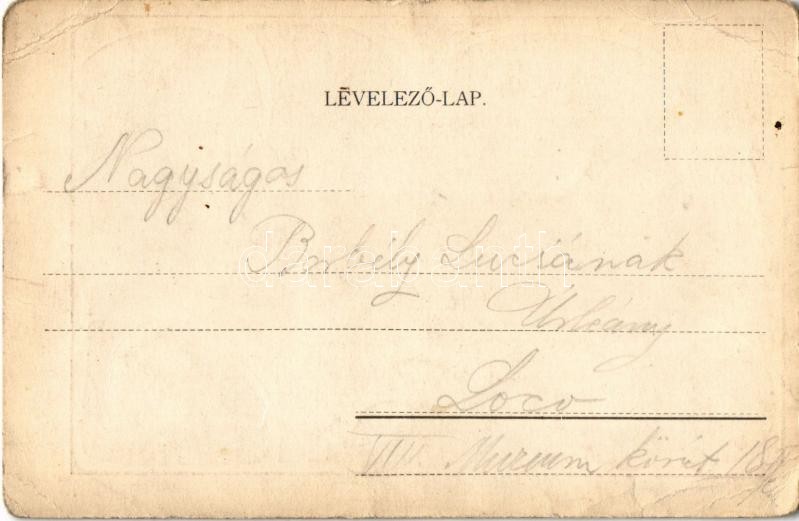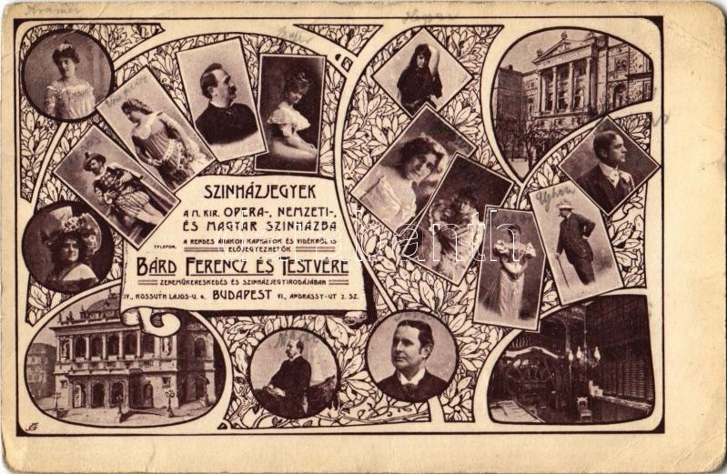 Description: Bárd Ferencz és Testvére Zenemű kereskedés és Színházjegy iroda reklámlapja. Színészek és színésznők, Opera, Magyar Színház; Budapest, Kossuth Lajos utca 4 és Andrássy út 2. / Hungarian Music shop and Theater Ticket Office advertisement card. Art Nouveau (EB)