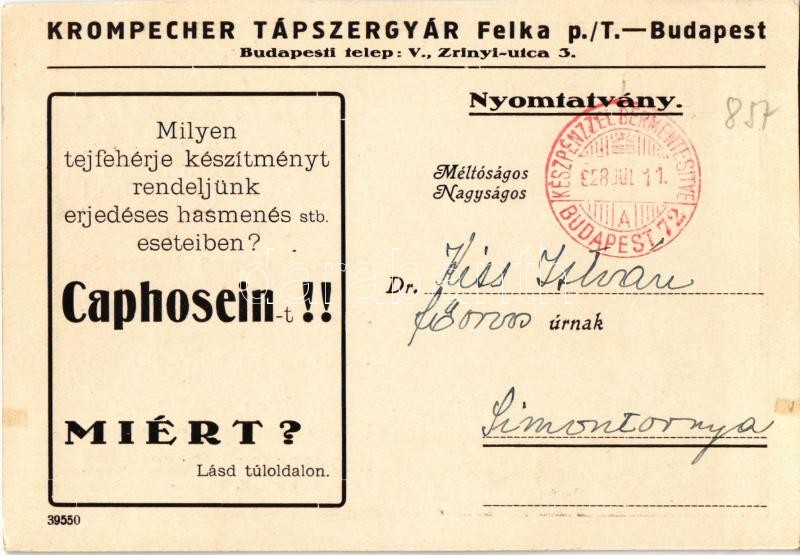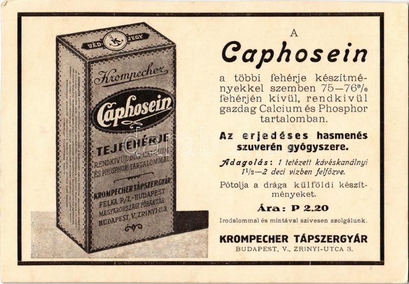 Caphosein tejfehérje, az erjedéses hasmenés szuverén gyógyszere. Krompecher Tápszergyár reklámja / Hungarian medicine advertisement for diarrhea