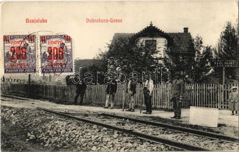 https://www.darabanth.com/en/33-Major-auction/33.1/Postcards/Bosnia-and-Herzegovina~13920/1923-Banja-Luka-Banjaluka-Dobrasova-Gasse-street-railway-crossing-with-railwaymen~II2125694