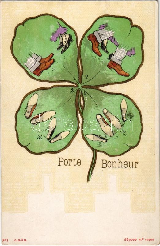 Porte Bonheur / Lucky charm. French gently erotic art postcard, clover. G.G.a M. 903. Art Nouveau litho