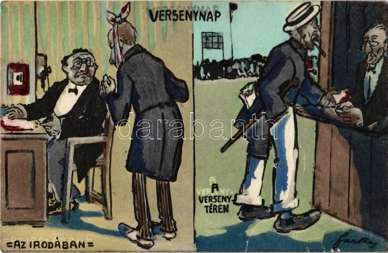 Versenynap az irodában és a versenytéren. Humoros lap. Divald Károly 2... https://www.darabanth.com/en/33-Major-auction/33.1/Postcards/Humour~13984/Versenynap-az-irodaban-es-a-versenyteren-Humoros-lap-Divald-Karoly-2086-1909-Racing-day-in-~II2133952