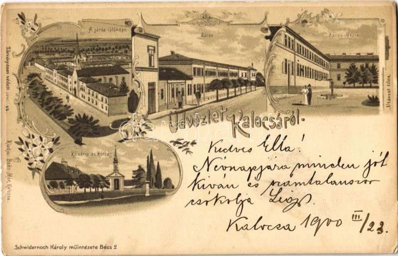 1900 Kalocsa, zárda látóképe és udvara, kálvária és kórház. Kiadja Behr Mór. Schwidernoch Károly Art Nouveau, floral, litho (EK)