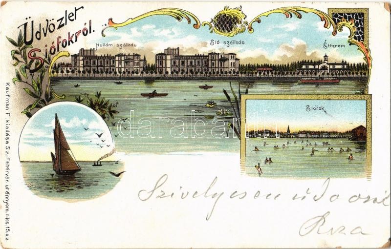 1900 Siófok, Hullám és Sió szálloda, étterem, vitorlás. Kaufman F. kiadása Art Nouveau, floral, litho (EK)