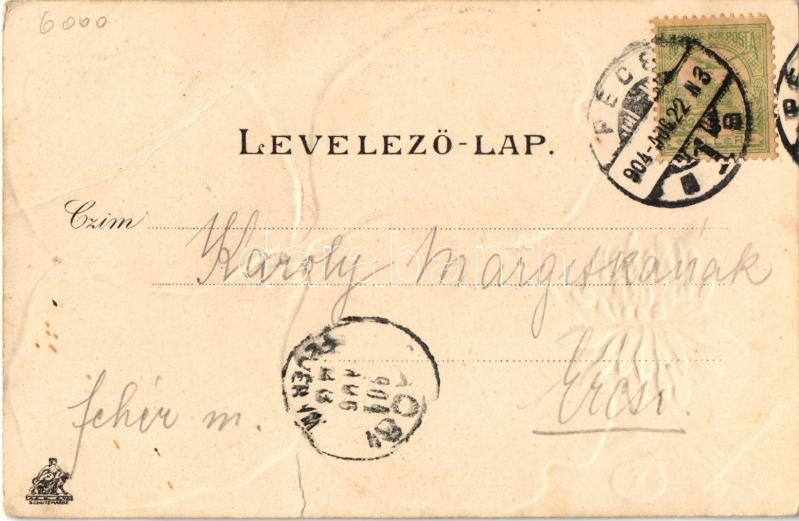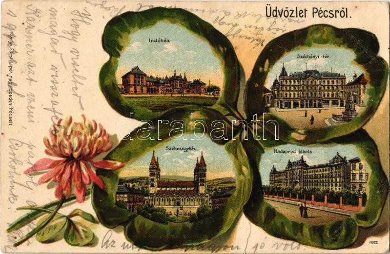 1904 Pécs, indóház, vasútállomás, Széchenyi tér, székesegyház, hadapród iskola. Fürst Lipót kiadása, szecessziós montázs lóherével, Art Nouveau, Emb. litho (EB)