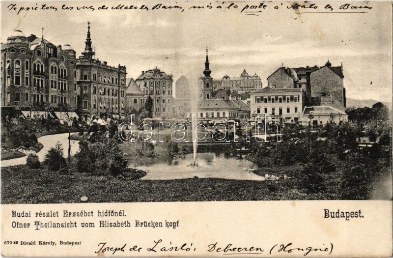Budapest I. Tabán, Döbrentei tér, Erzsébet hídfő, park, Rácz fürdő, bor és sörcsarnok, üzletek. Divald Károly 670.