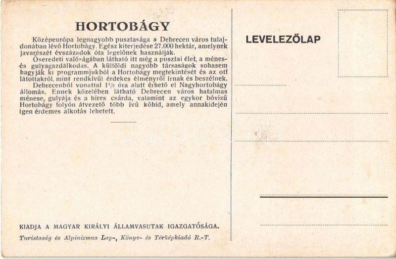 Description: Hortobágy. A Magyar Királyi Államvasutak turisztikai reklám képeslap, kiadja Klösz György és Fia / Hungarian State Railways tourism campaign advertisement s: Pólya T. (EK)