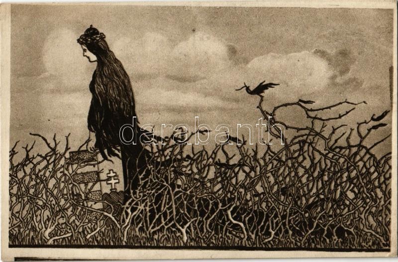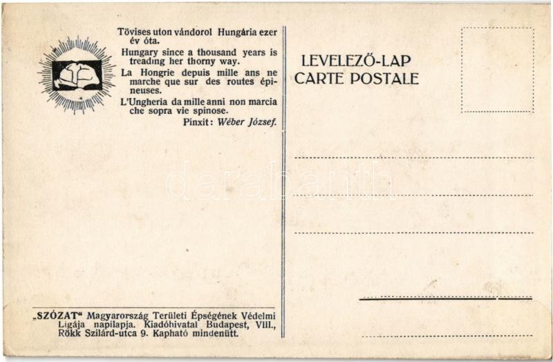 Description: Tövises úton vándorol Hungária ezer év óta. Kiadja a 'Szózat' Magyarország Területi Épségének Védelmi Ligája / Hungarian irredenta art postcard s: Wéber József