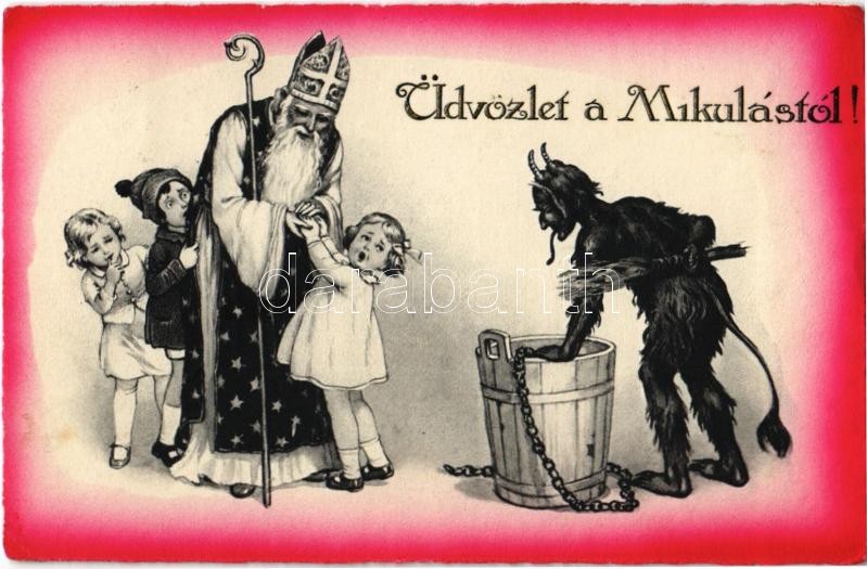 https://www.darabanth.com/en/33-Major-auction/33.1/Postcards/Krampus~13989/1934-Udvozlet-a-Mikulastol-Krampusz-Saint-Nicholas-and-Krampus~II2132926