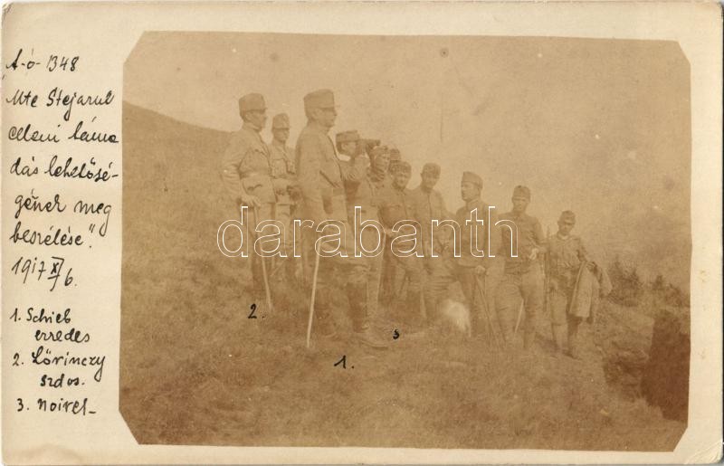 Description: 1917 A 1348 Mte Stejarul elleni támadás lehetőségének megbeszélése: Schieb Károly ezredes, Lőrinczy százados, Noiret / WWI K.u.K. (Austro-Hungarian) military, discussing an attack with colonel and captain. photo