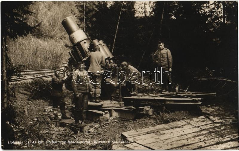 Hofmann cs. és kir. altábornagy hadcsoportja, Mozsarak Slawskoban. Hadifénykép Kiállítás, Hadsegélyező Hivatal kiadása / WWI K.u.K. (Austro-Hungarian) military, cannons in Slawsko