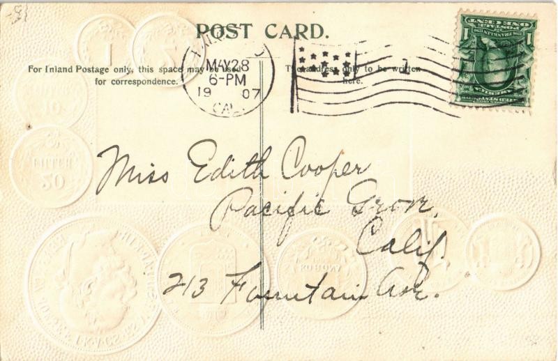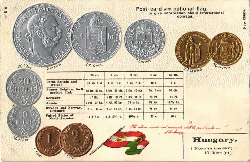 1907 Magyarország érméi / Coins of Hungary. Postcard with national flag to give information about international coinage. Emb. litho