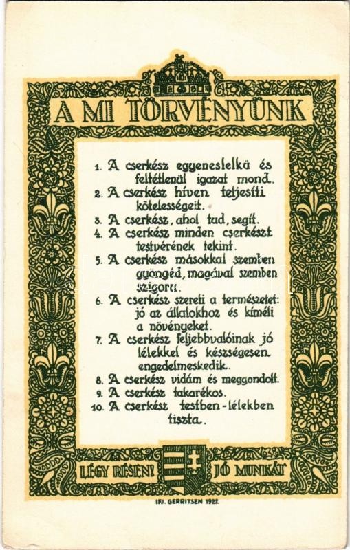 Description: A Mi Törvényünk. Légy résen, Jó munkát! 1922. Kiadja a Magyar Cserkész Szövetség hiv. lapja a "Magyar Cserkész" / Our Law. Hungarian scout art postcard s: Ifj. Gerritsen (EK)