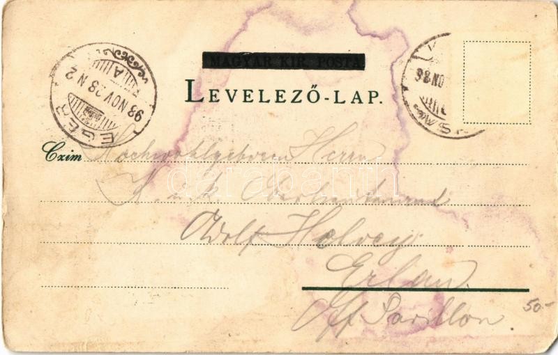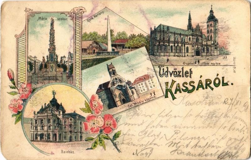 1898 Kassa, Kosice; Mária szobor, Rankherlány (Ránkfüred) szökőforrás, Erzsébet székesegyház, Szent Mihály kápolna, színház / statue, Herlany fountain spring, cathedral, chapel, theatre. W.G. No. 110. Art Nouveau, floral, litho (EM)