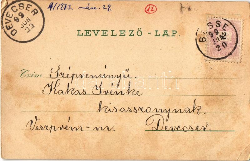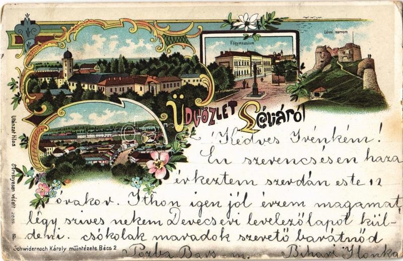 1899 Léva, Levice; Főgimnázium, várrom. Schwidernoch Károly kiadása / grammar school, castle ruin. Art Nouveau, floral, litho (EK)