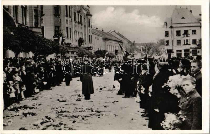 1938 Léva, Levice; bevonulás, Magyar királyi honvédség a Virágos úton. Foto Hajdú / entry of the Hungarian troops + "1938 Léva visszatért" So. Stpl