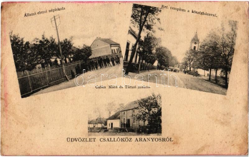 Description: Csallóközaranyos, Zlatná na Ostrove; Állami elemi népiskola, Református templom és községháza, Csóka Máté és Társai malom / school, town hall, Calvinist church, mill (EK)