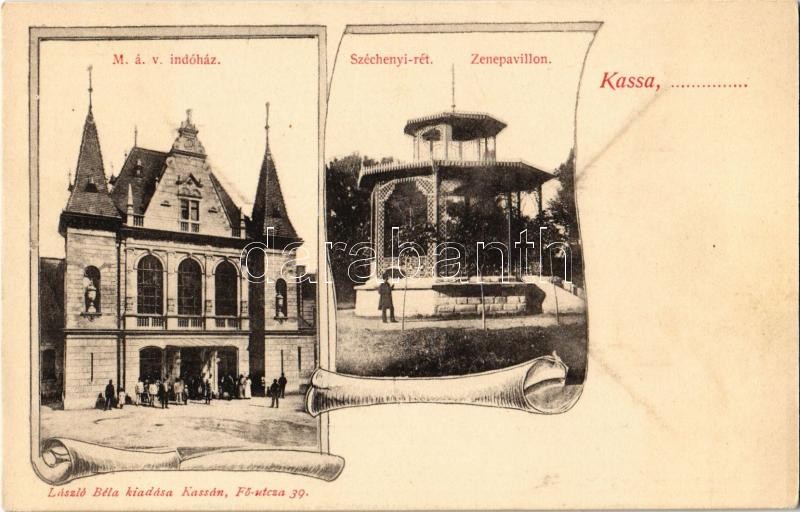 Kassa, Kosice; MÁV indóház, Széchenyi rét, zenepavilon. László Béla kiadása / railway station, park and pavilion. Art Nouveau
