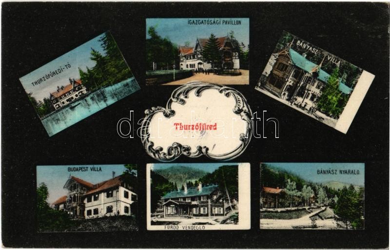 Thurzófüred, Kupele Turzo (Gölnicbánya, Gelnica); Budapest Villa, Bányász nyaraló, Fürdő vendéglő, tó, igazgatósági pavilon. Fischer Ármin 912 / villas, spa restaurant, lake, directorial pavilion. Art Nouveau (EK)