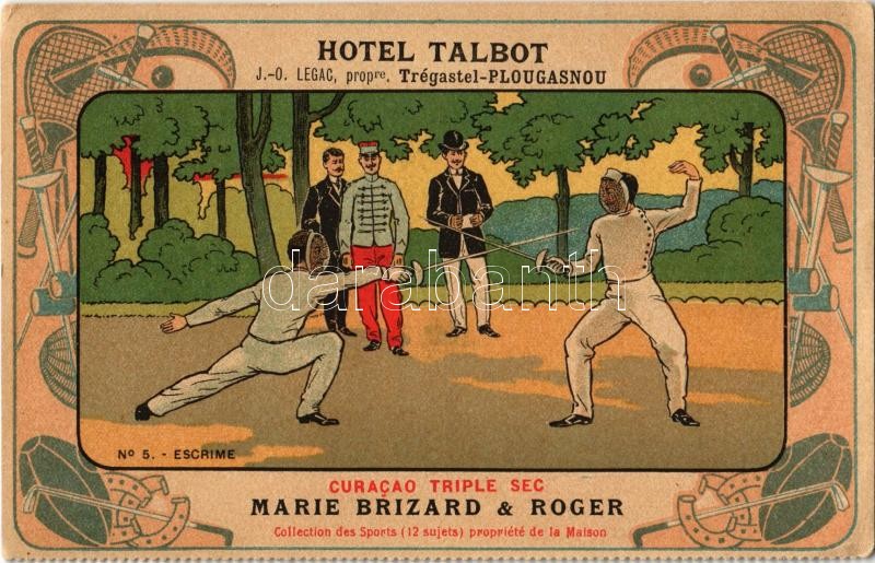 Hotel Talbot, Trégastel- Plougasnou. Curacao Triple Sec Marie Brizard & Roger No. 5. Escrime / fencing, advertisement. Art Nouveau litho
