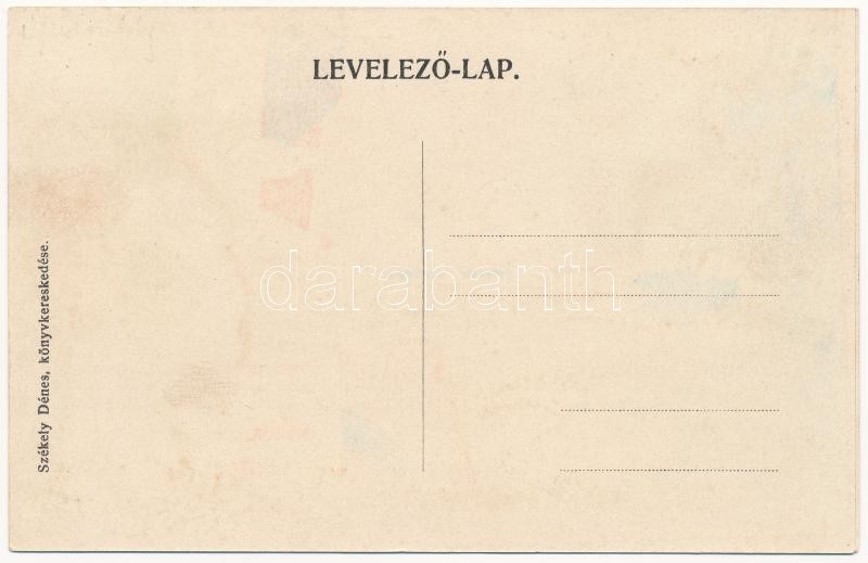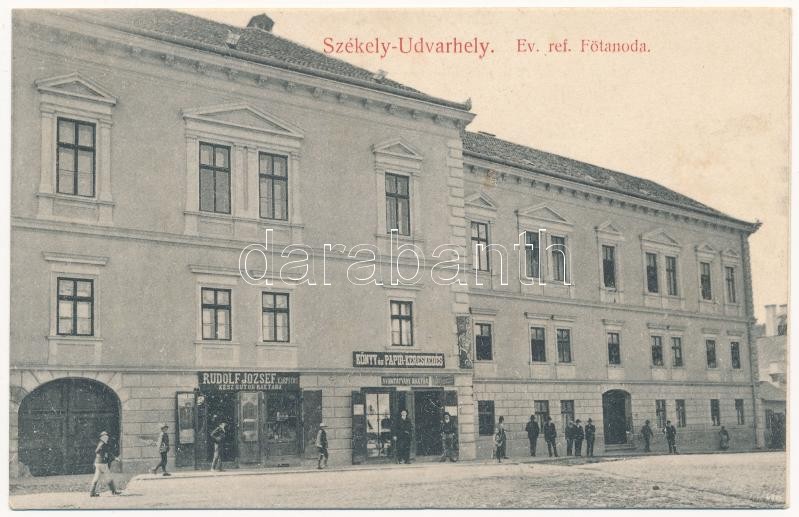 Description: Székelyudvarhely, Odorheiu Secuiesc; Református főtanoda, Rudolf József kárpitos kész bútorraktára, könyv és papír kereskedés és nyomtatvány raktár.Székely Dénes kiadása / Calvinist school, shops (kicsit ázott / small wet damage)