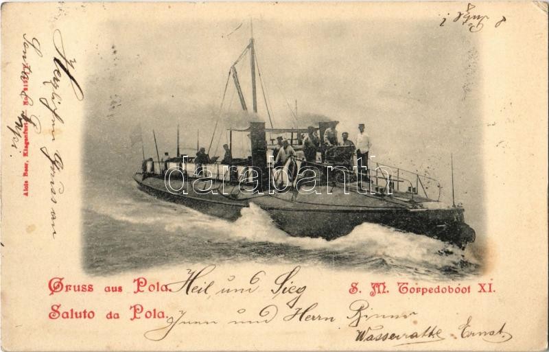Description: 1901 SM Tb XI, osztrák-magyar haditengerészet torpedónaszádja (később olasz Francesco Rismondo) / Gruss aus Pola! K.u.K. Kriegsmarine, SM Tropedoboot XI / Austro-Hungarian Navy torpedo boat. Alois Beer (EK)