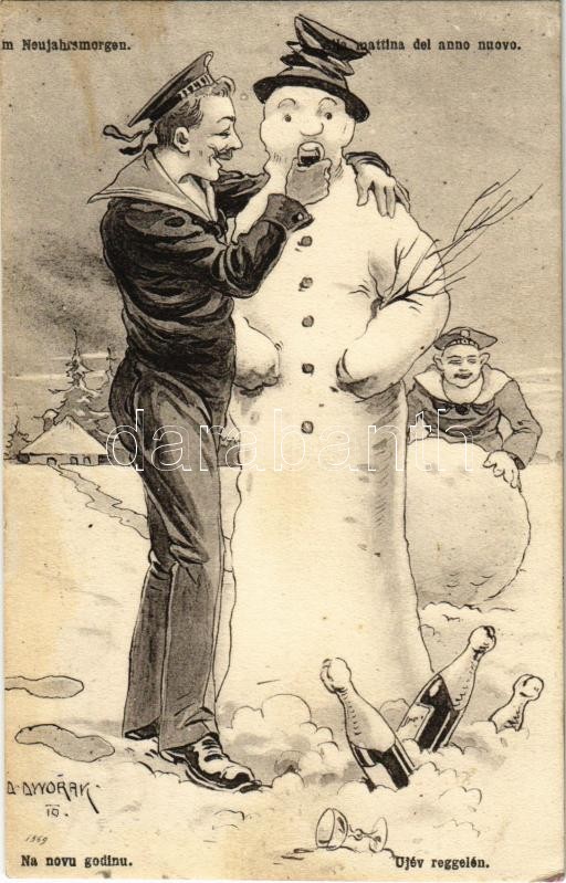 Description: Am Neujahrsmorgen. K.u.K. Kriegsmarine Matrose / Újév reggelén / Na novu godinu / Alla mattina del anno nuovo / Austro-Hungarian Navy mariner humour art postcard, New Year, drunk mariner with snowman. G. Fano, Pola 1910-11. 2573. s: Ed. Dworak